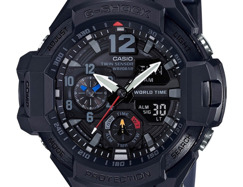 The men’s Gravitymaster series by Casio G-SHOCK has a new “Black Out” colorway, with accents of white, blue and red on the face and hands.